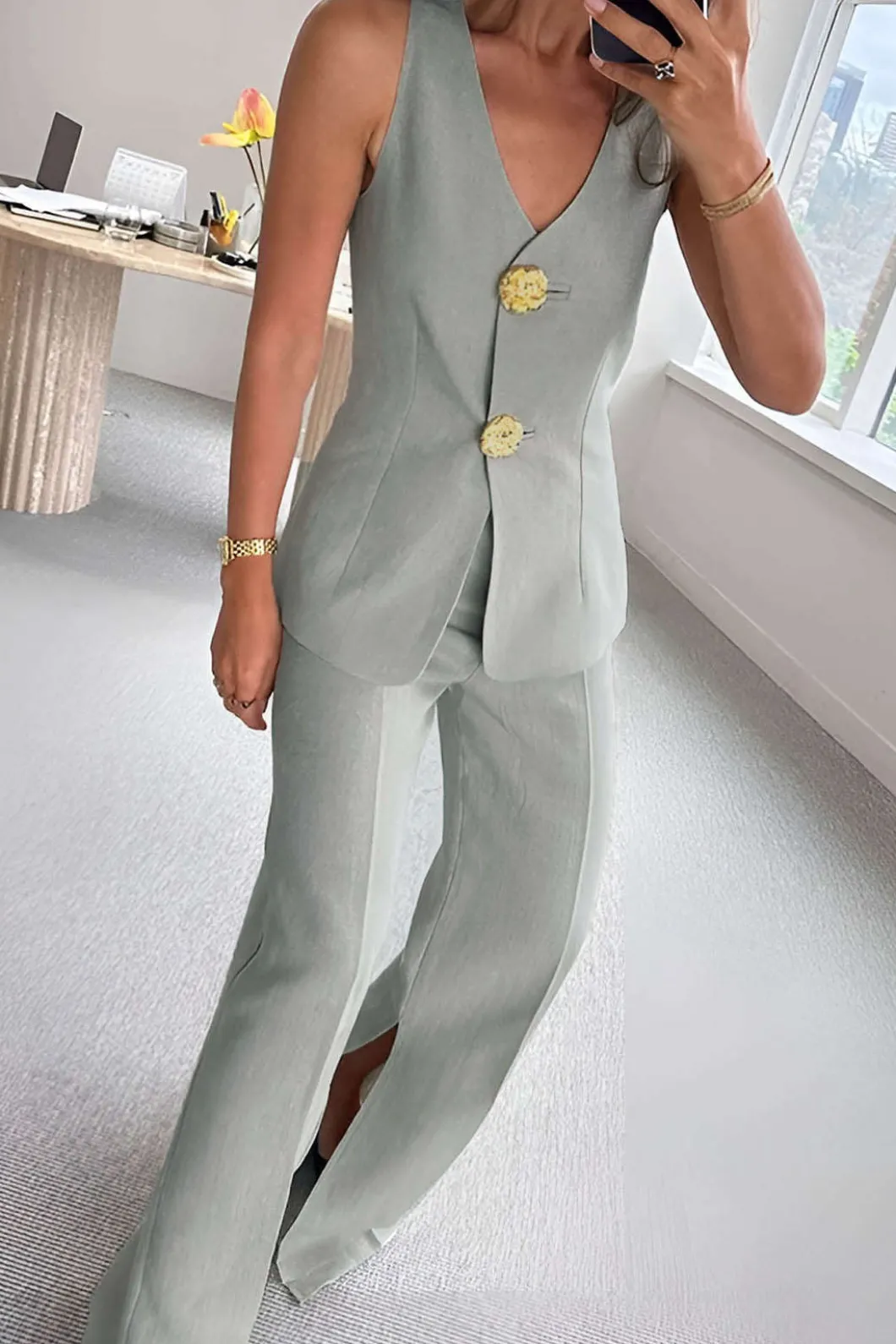 DetailsOccasion: WorkCategory: SetsComposition: 100% PolyesterSheer: Not SheerColor: GrayMeasured in size: SLength: 16.1…